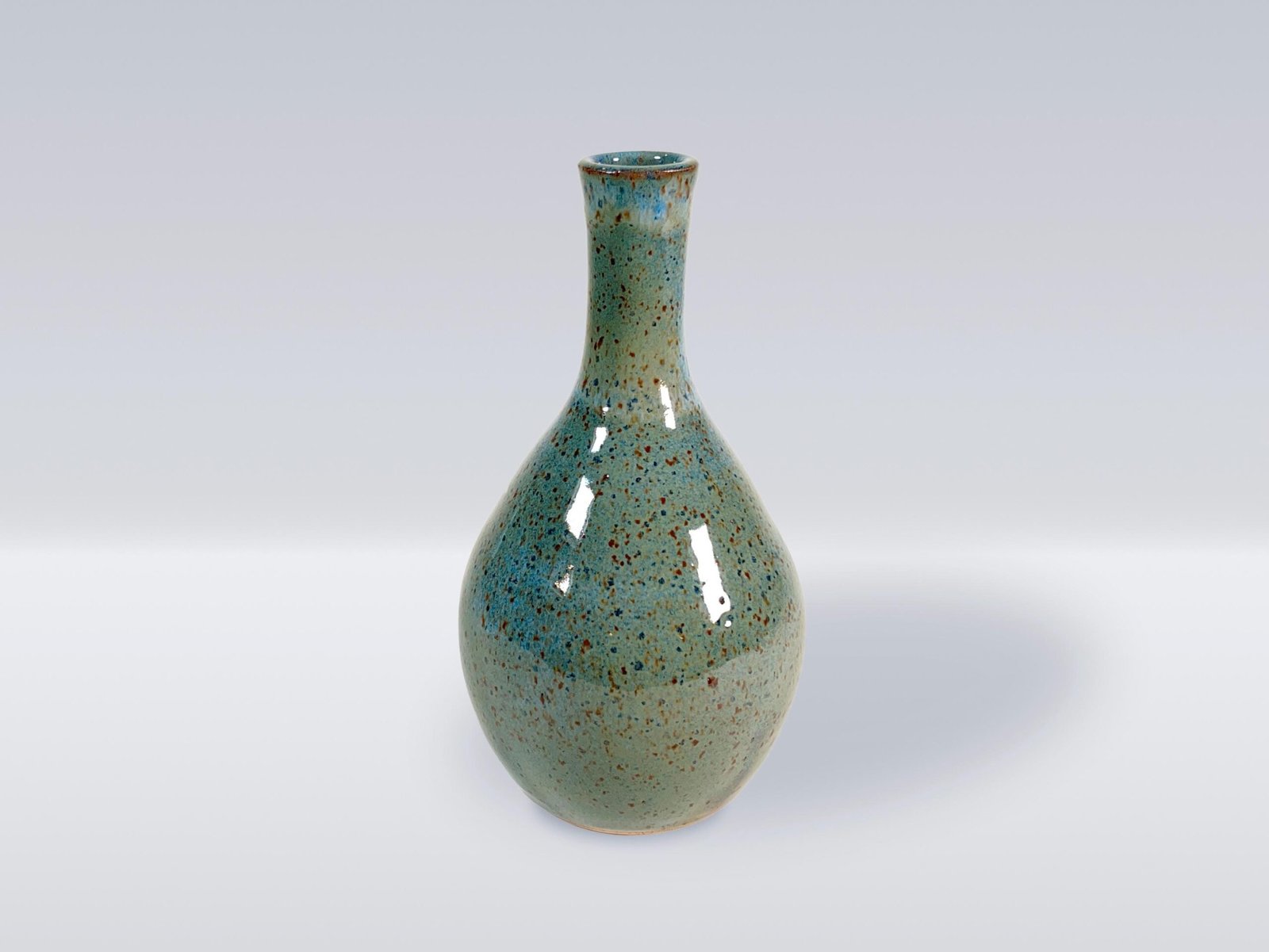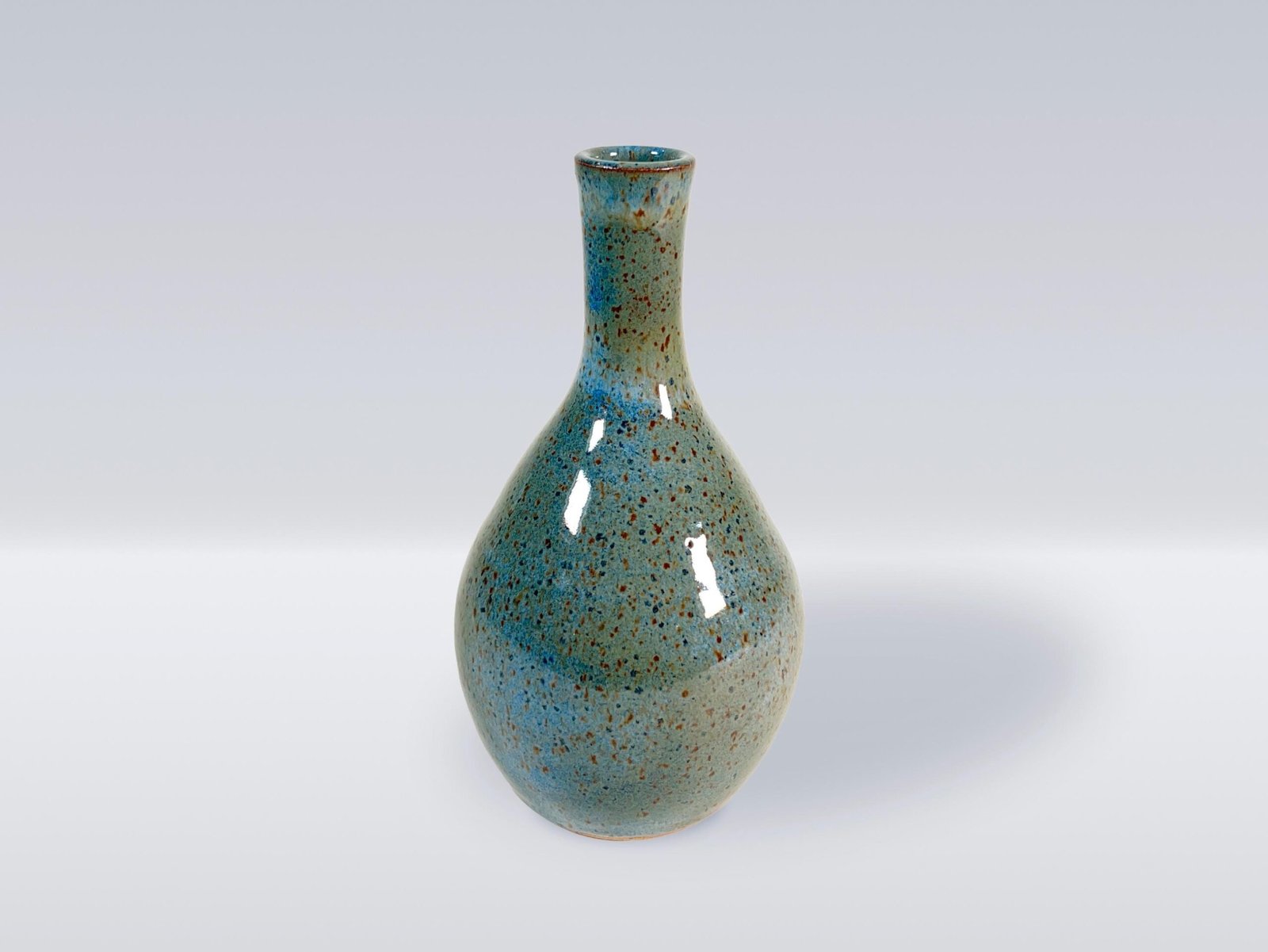 This 7.75 inch tall wheel-thrown bottle is perfect for flowers or other decorative items. The bottle is glazed with a blue green glaze on a speckled mid-fire stoneware.
