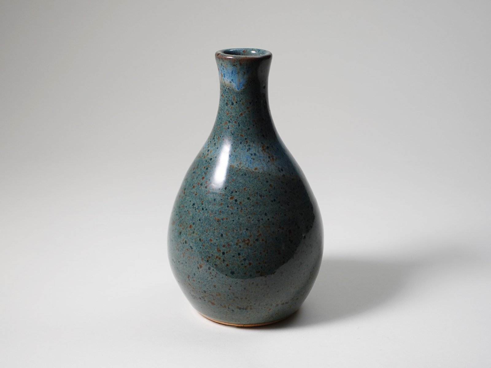 This 7 inch tall wheel-thrown bottle is perfect for flowers or other decorative items. The bottle is glazed with a blue green glaze on a speckled mid-fire stoneware.
